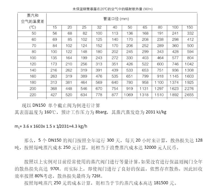 輪胎橡膠、玻璃制品等這些行業中,蒸汽的能耗降低是企業競爭優勢之一,有時蒸汽控制的好壞還會影響生產效率和產品的品質。蒸汽閥門的散熱問題是很嚴重的,我們通過以下公式可以計算