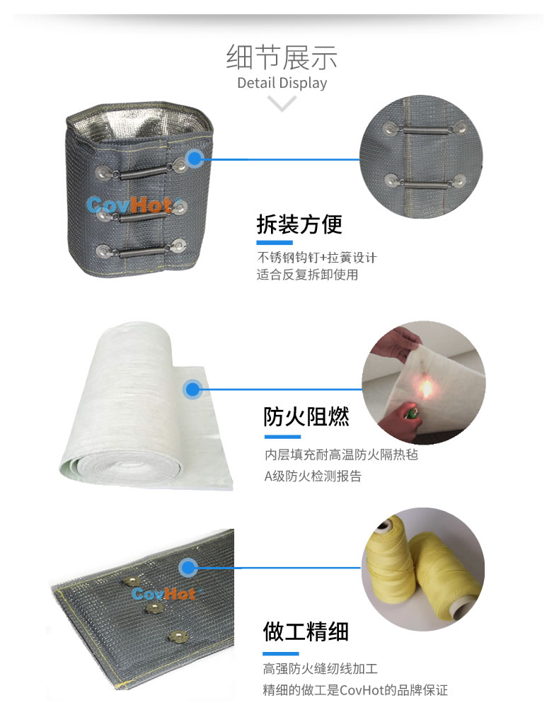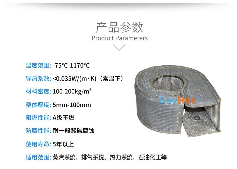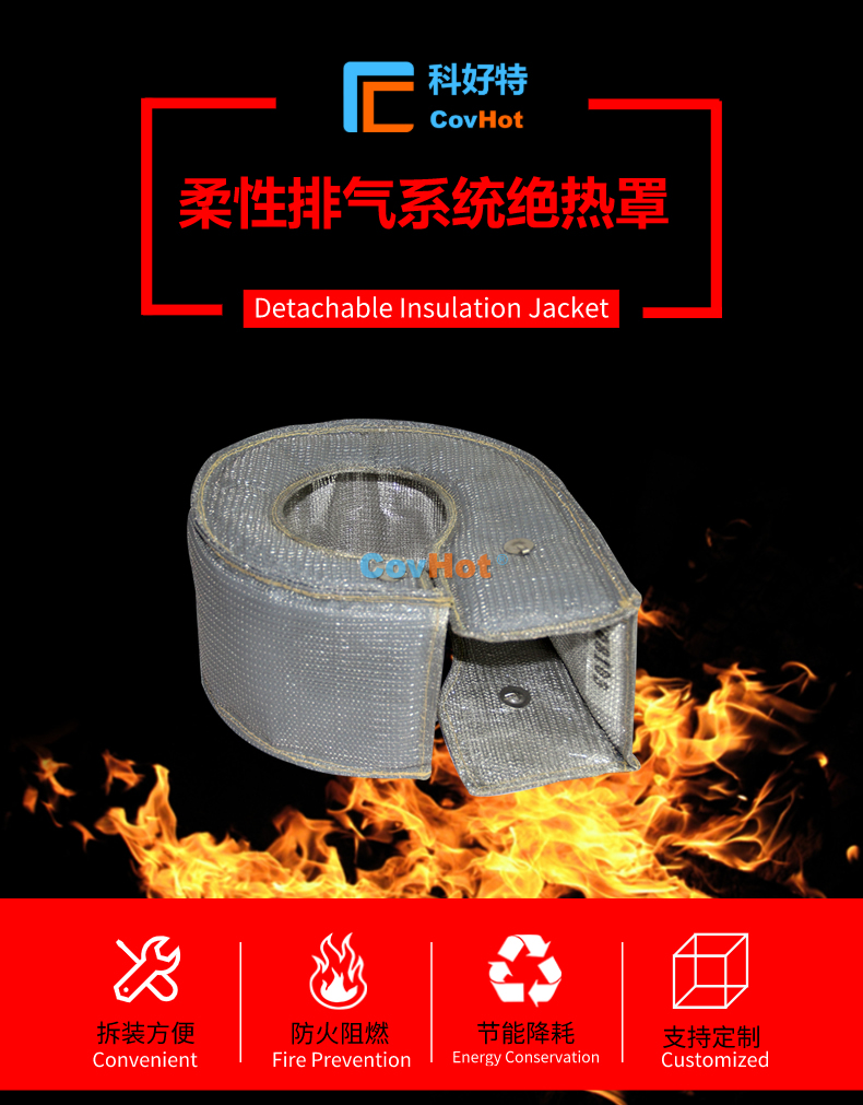 排氣管隔熱套具有易拆裝、可反復循環(huán)使用等特點,并且具有柔性,可根據(jù)排氣管的形狀,走向設計制作隔熱套,與排氣管貼合度高,包裹性強。能夠有效解決車輛排氣系統(tǒng)保溫隔熱難題。