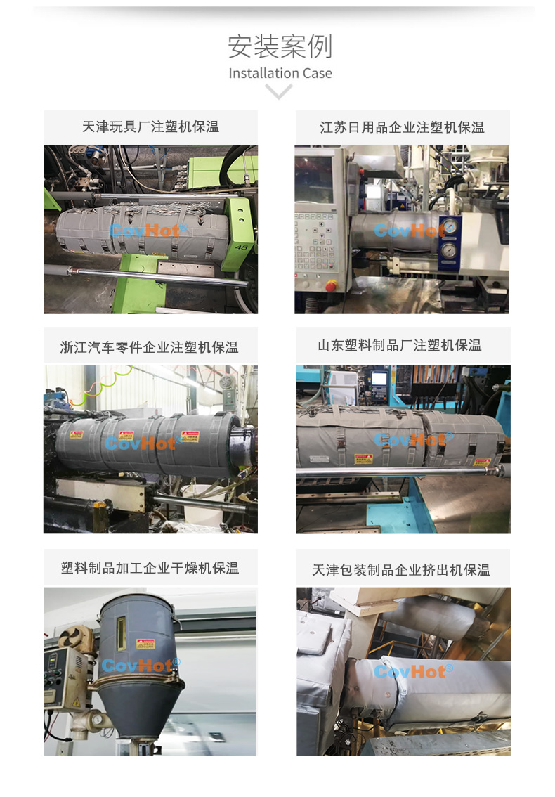 塑料制品行業(yè)的注塑機(jī)在工作時(shí),需要對(duì)物料進(jìn)行加熱處理,內(nèi)部溫度高達(dá)300℃以上。注塑機(jī)節(jié)能保溫罩產(chǎn)品可以有效節(jié)能省電,以達(dá)到注塑機(jī)保溫隔熱的效果,從而提高加工合作率。使注塑機(jī)表面溫度降低至50℃以內(nèi),降低車間的整體溫度。