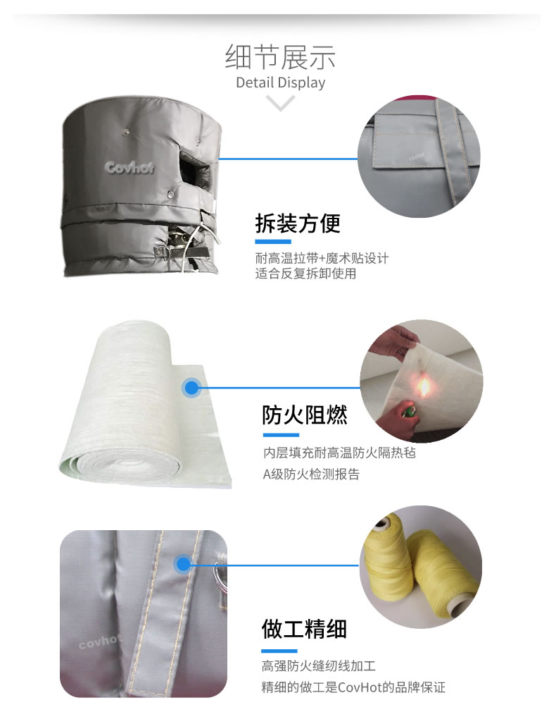 科好特covhot柔性可拆卸可拆卸擠出機(jī)保溫套按照用戶需要設(shè)計(jì)制作而成。安裝可拆卸保溫套后,可以讓設(shè)備表面溫度可降到40℃左右,觸摸不燙手。具有隔熱﹑防火防水、防油污、不腐化、耐腐蝕、表面可擦洗、強(qiáng)度大、易彎曲,深受廣大擠出機(jī)設(shè)備用戶喜愛。